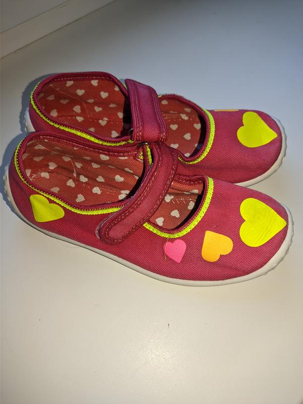 Розовые в сердечки, на липучках. Размер 29, потолка 18 см. Удобные для деток, которые не любят сложные застежки. Из недостатков ребенок носил в садочку.За детальной информацией вводите в привод.