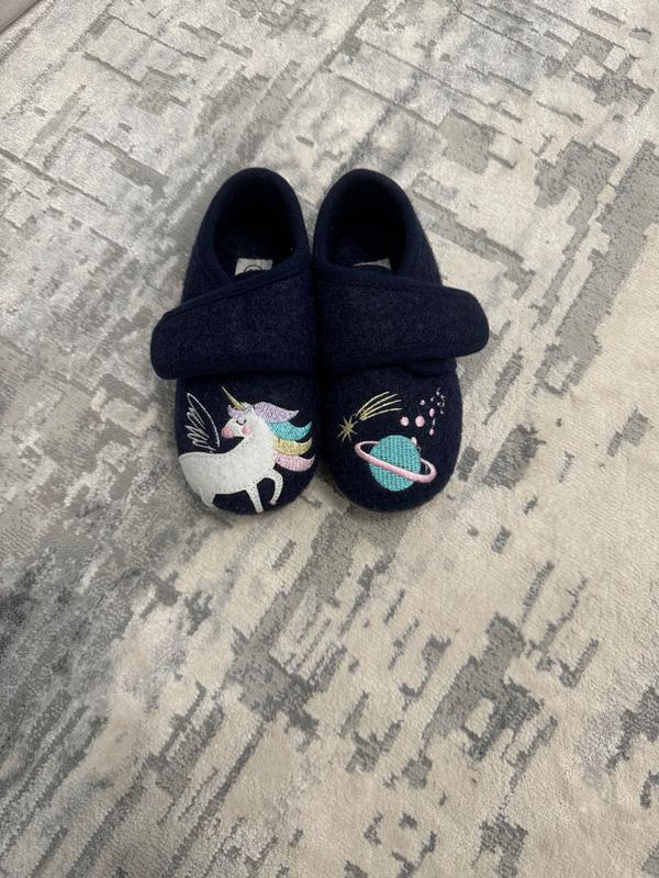 Удобные и шерстяные тапочки на липучке для девочки. Размер 26. Будет тепло и удобно. Стан красивый, скатывался немного материал, но это легко почистить.