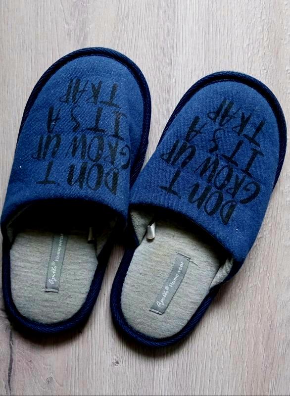 Синие тапочки от бренда apollo homewear с надписью "don’t grow up it's a ttrap".