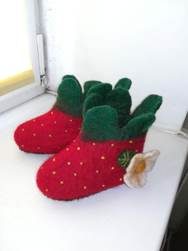 Очень красивые тапочки-клубнички из валяной шерсти,размер 24-25