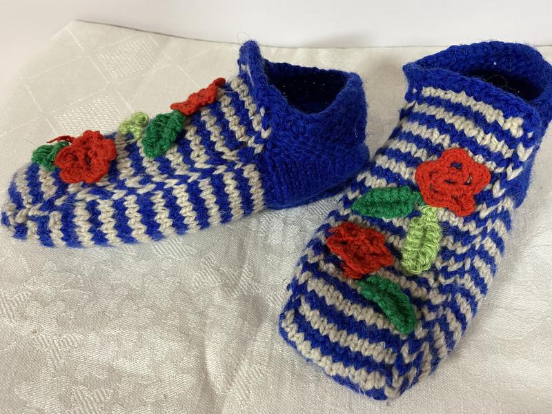 Ажурные эксклюзивные тапочки ,ручной работы из шерстяной нити , украшенные цветочками . Цвет : синий длина подошвы ( без растягивания )21 см Хотите выглядеть стильно и иметь комфортную ,красивую тёплую обувь? То это для Вас !