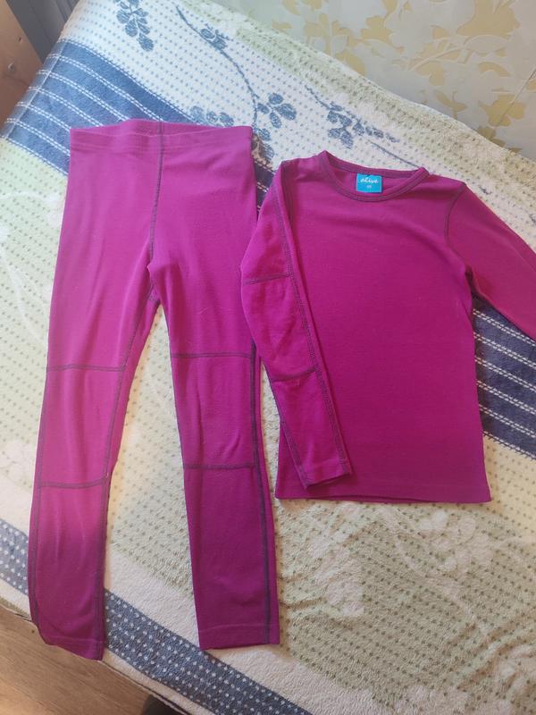Продам комплект термобелья немецкого бренда Alive. по бирке 128, крупномерит длина брюк 72 длина кофты 47 плечи 26 рукав от плеча 44 состояние хорошее. из нюансов только катышки цвет фиолетовый, как на первом фото
