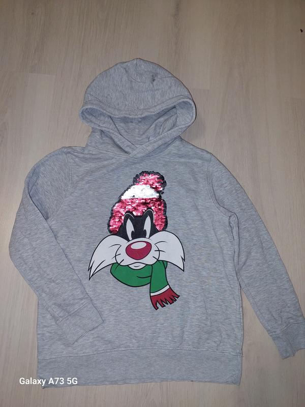Світер фірма zara. З середини байка. на вік 9 років, зріст 134. Спереді котик. Паєткі на шапці двосторонні.