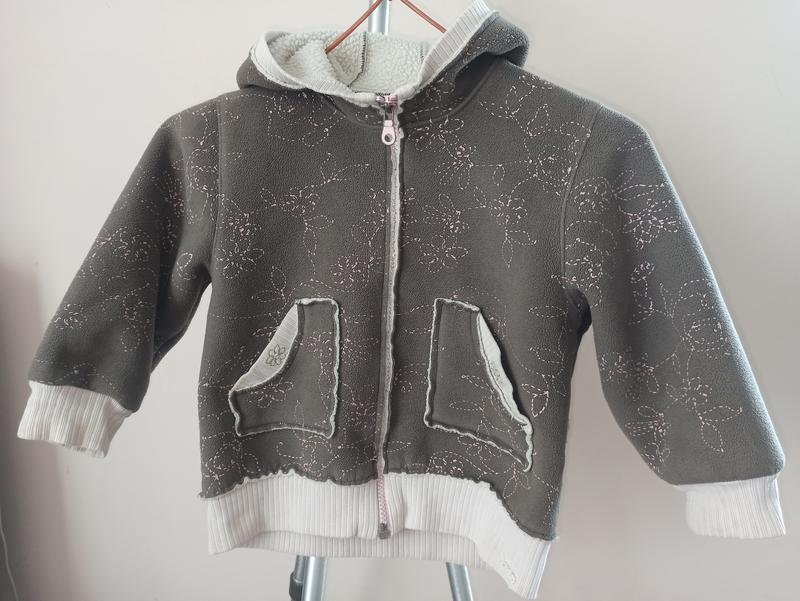 Тепленькая кофточка на молнии Длина изделия -40 см Длина рукава по внешнему шву - 33 см Длина рукава по внутреннему шву - 24 см Ширина в области плеч полуобхват - 31 см Ширина в області живота 37 см. Есть маленький недостаток - аккуратный шов, который почти незаметно показала на фото.