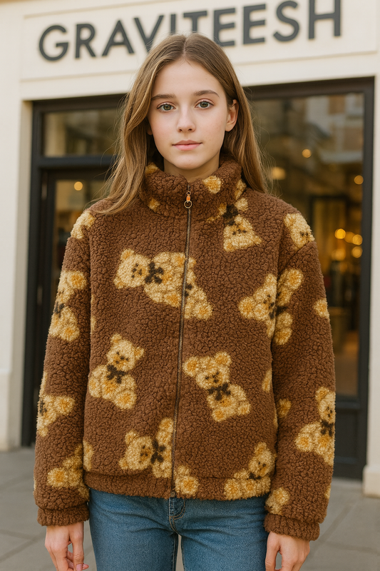 Плюшевая кофта тедди для девочки, коричневая с мишками, теплая флисовая на молнии / 9-10 р...