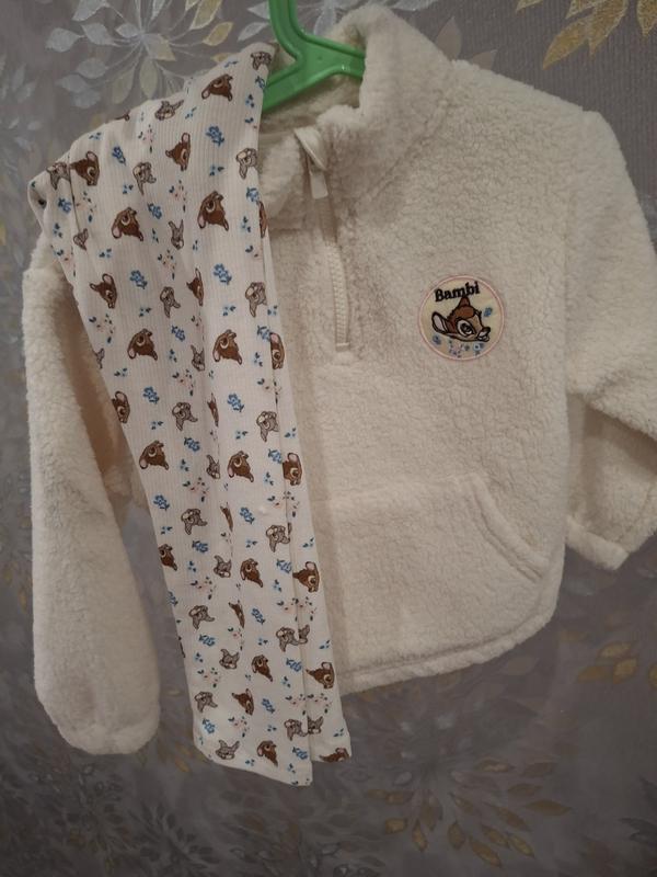 Лосинки без утепления и теддик – это комплект от Примарк на 2-3 года. Новый, но без бумажной бирки. Кофточка и лосины очень мягкие и уютные. И очень красивый принт из Бэмби.
