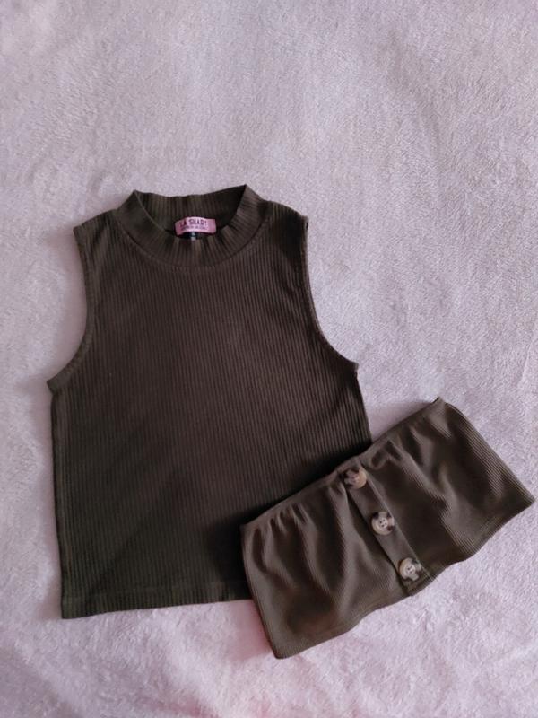 По цвету что-то среднее между тёмным и светлым хаки на фото. Коротенький топ гофре с пуговицами в подарок. Замеры прилагаются. Под высокие джинсы палаццо стильно и современно. Удачных обновок!