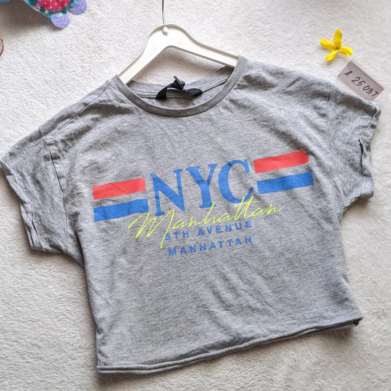 класний топ сірого кольору з принтом нью-йорк , є слід від праски можна спробувати зробити крутий декор під руками 43 53 довжина по спинці майже 40 немає жодних нюансів крім зіпсованої наклейки