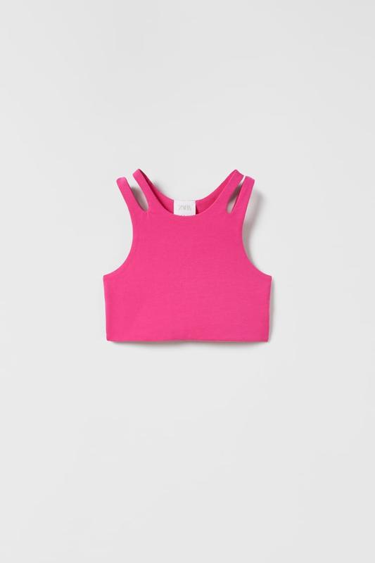 В наявності колір Фуксія т Топ з круглим вирізом, короткими рукавами та вирізом на плечах.