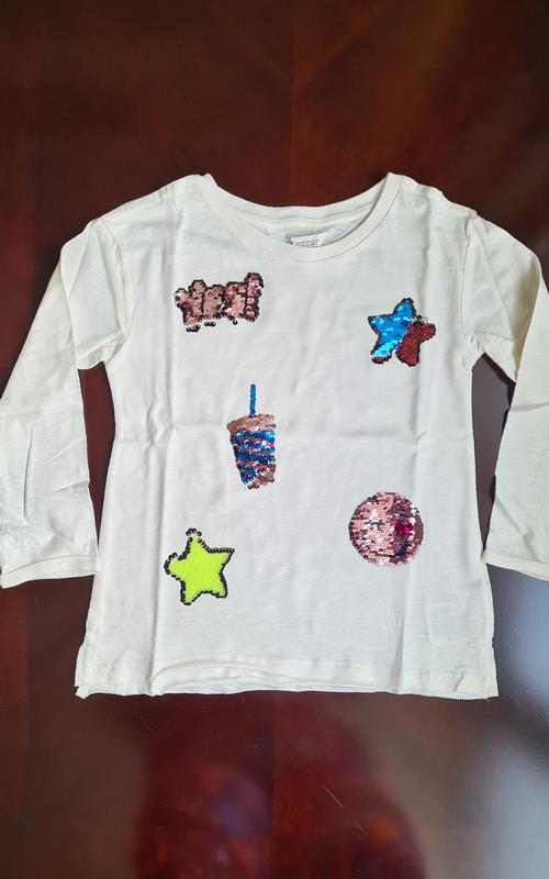Топ из хлопка, декорирован аппликациями из пайеток. Рукава с отворотами, 6-8 лет ( 122-128 см)