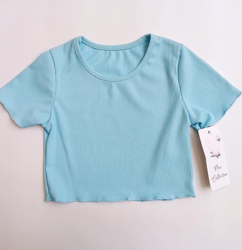 короткий топ в рубчик, блакитного кольору 4: длина 26см, обхват 50см 6: длина 29см, обхват 56см 10: длина 33см, обхват 64см