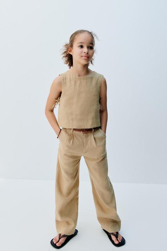 Бежево-коричневый цвет. На 13-14р 164см Топ-безрукавка с круглым воротником. Зав’язки по боках. Вырез в виде капли с пуговицей сзади.