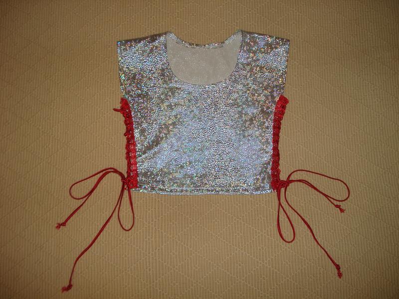 Топ для выступлений на девочку 6-7 лет Ткань тянется. По бокам - шнуровка. Цвет - серебристый + красный. Топ в очень-очень хорошем состоянии. ЗАМЕРЫ: Длина - 29,5 см. Ширина (от подмышки до подмышки) - 28 см.
