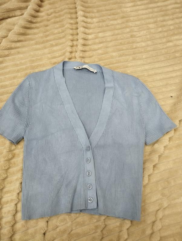 Топ приятного голубого цвета, пуговицы функциональные, качество очень хорошее. Состояние новое. Размер S также подходит на размеры M и L.
