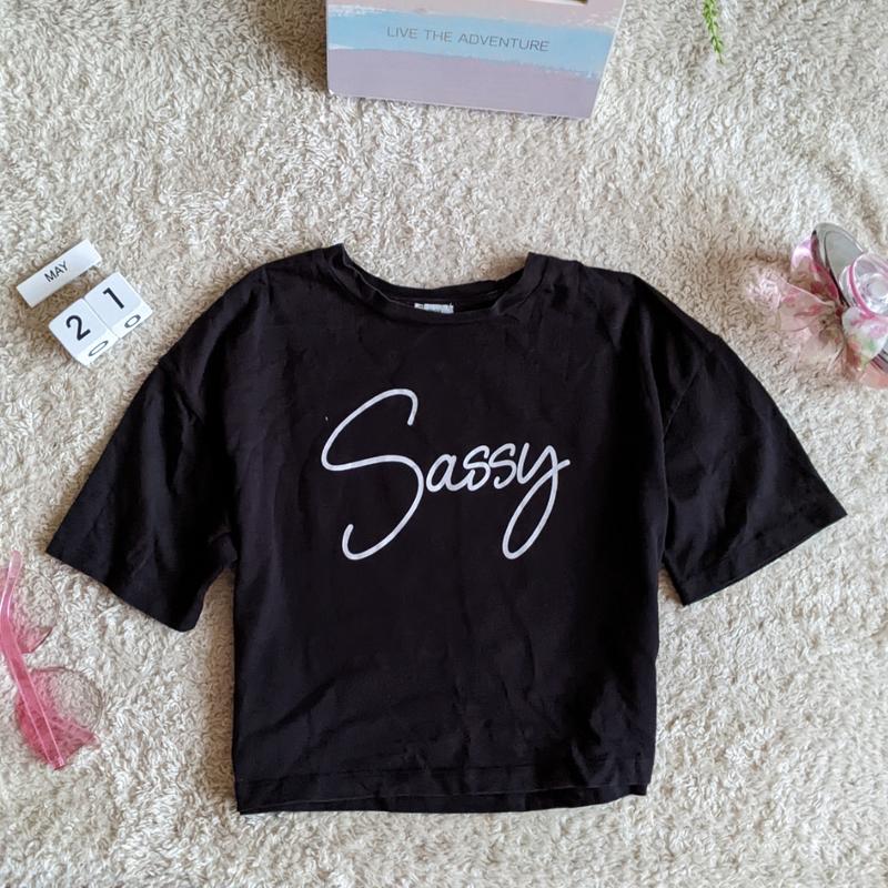 River Island Top 7-8 лет с надписью sassy классный стильный чуточку имеет признаки ношения вдоль у ворота абсолютно незаметно можно постирать с салфетками для черного, пог 41-51 см