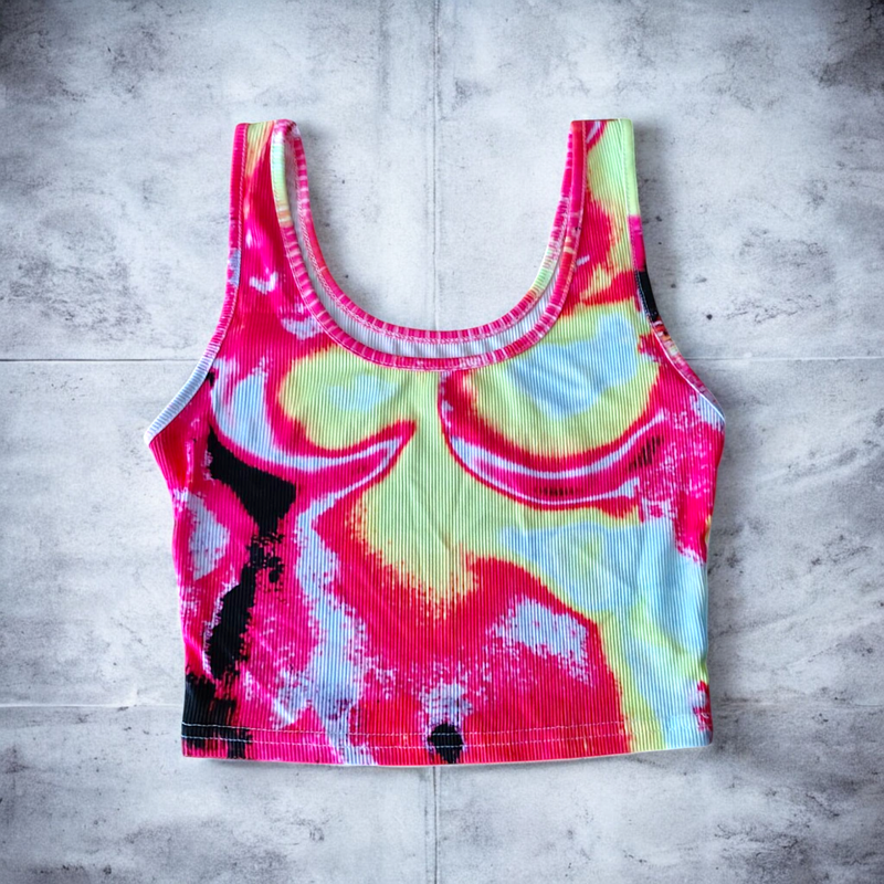 Подписывайтесь на мою страницу. Новый яркий топ, с интересным принтом. Цвет как на первом фото. Легкая ткань, очень красиво тянется. Замеры: длина 37 см, полуобхват груди 33 см, полу обхват талии 28см.