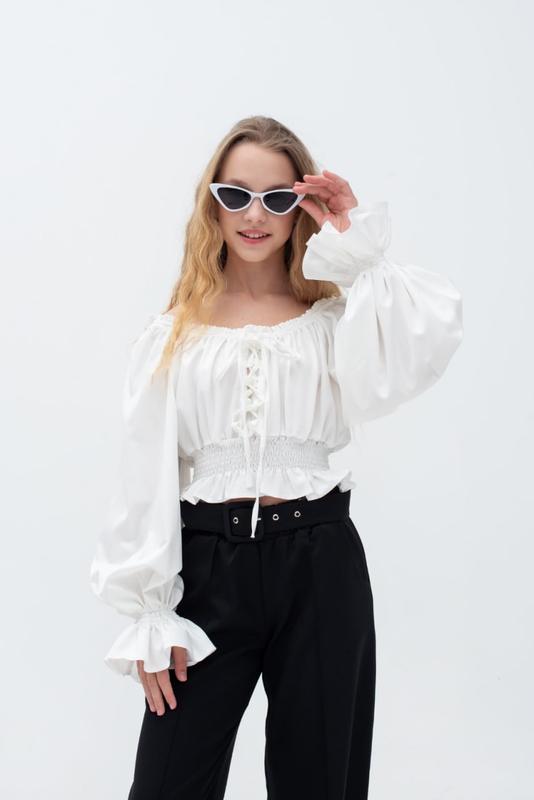 Стильный топ для девочек Ткань - софт, хорошего качества. Цвет- молочный. Замеры: 140 длина от плеча - 37см, полуобхват груди - 37см, рукав- 58см. 146 длина от плеча- 39см, полуобхват груди - 39см, рукав - 61см. 152 длина от плеча- 41см, полуобхват груди - 41см, рукав - 63см. 158 длина от плеча- 43см, полуобхват груди - 43см, рукав - 65см. Размеры в наличии: 140-1шт 146-1шт 152-1шт арт мод