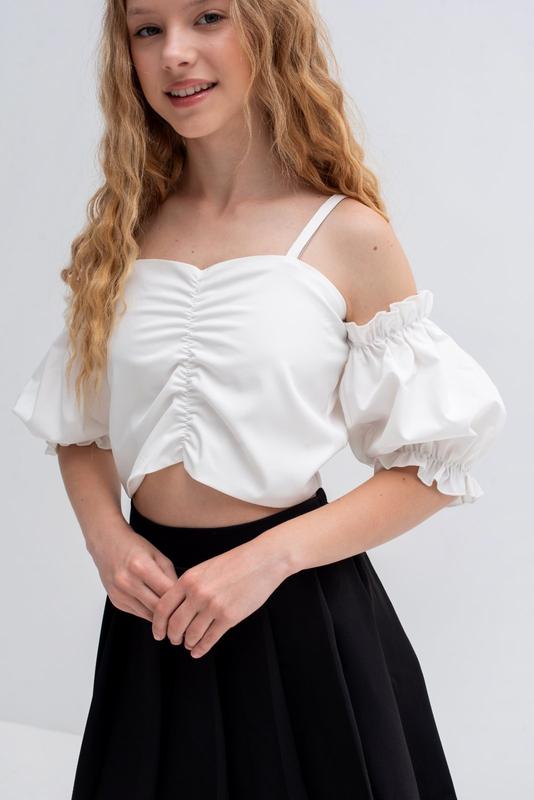 Модный и стильный! Верх и низ топа по спинке на резинке, тянется. Тканина - софт. Цвет - молочный. Замеры: 140 длина - 20см, полуобхват груди - 31см, тянется до 35см. 146 длина - 22см, полуобхват груди - 33см, тянется до 37см. 152 длина - 24см, полуобхват груди - 35см, тянется до 38см. 158 длина - 25см, полуобхват груди - 37см, тянется до 42см. 164 длина - 29см, полуобхват груди - 39см, тянется до 45см. Размеры в наличии: 140-1шт 146-1шт арт мод