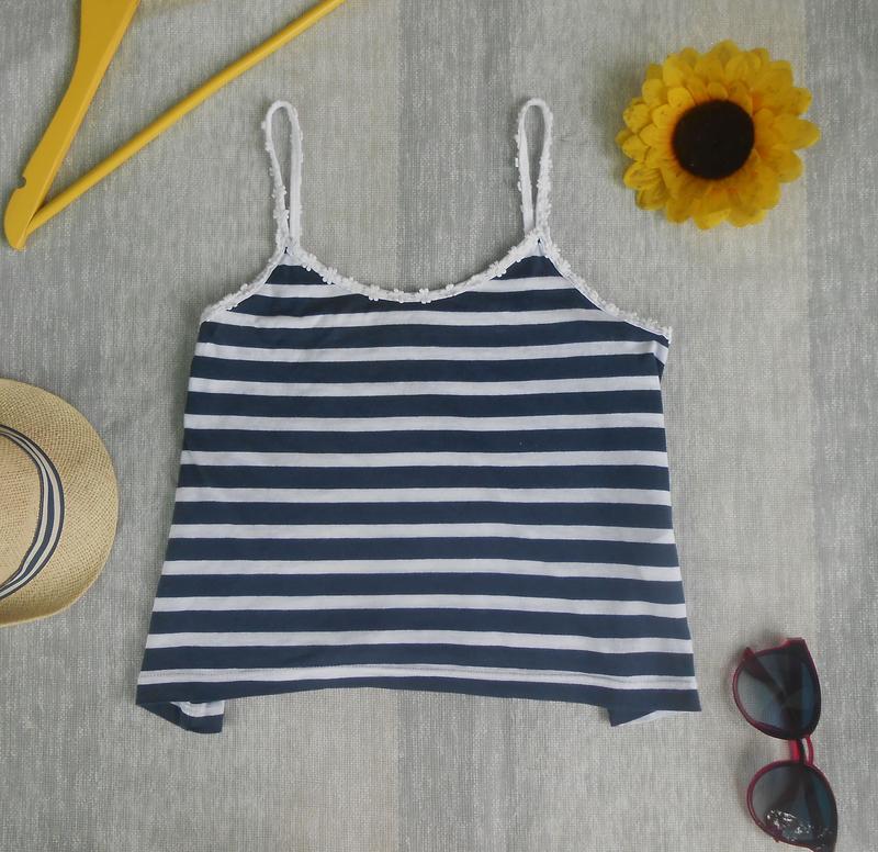 Майка в полоску идеальная 146-152 свободного фасона снизу к низу расширена в виде трапеции ширина по нижней части 58 см подмышки в состоянии покоя 37 см может тянуть до 44 даже больше состояние идеален 50 хлопок 50 вискоза фото 📏 различные камеры и освещение