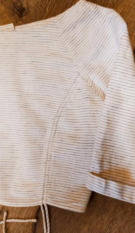 подростковый льняной топ для девочек, цвета Шампань, в полоску, застежка сзади, есть шнурки впереди, которыми регулируется длина топа, замеры: плечо с рукавом 40,рукав три четверти, ширина рукава полуобхват 16, полуобхват под рукавами 43, низ полуобхват 38, длина 40