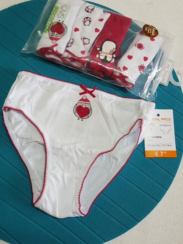Комплект трусиків брифів Пінгвіни на дівчинку італійського виробника OVS. В наборі 5 пар. Розміри в наявності: р. 110-116 - 5-6 років (ПОТ - 20,5см, глибина 18,5см) 100% котон Ціна вказана за набір