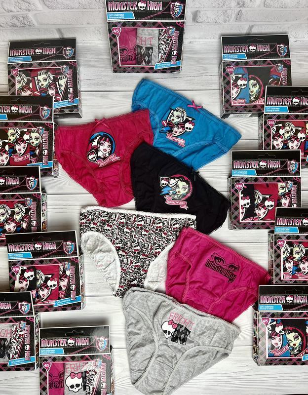 Трусики на девочку Monster High от Disney. Яркие хлопковые трусики идеально подойдут, как для ежедневного использования, так и на подарок,дут в коробке) Состав: 100% коттон. Материал хорошо тянется, очень приятный на ощупь, нежные приятные резинки не растягиваются и не выползают при носке. РАЗМЕРЫ: - 4-5 лет - По резинке в нерастянутом виде ширина 22 см, посадка 15 см - 6-8 лет - По резинке в нерастянутом виде ширина 23 см, посадка 15-15,5 см - 9-10 лет - По резинке в нерастянутом виде ширина 26 см, посадка 16-16,5 см КОЛЬОРИ в наборах: на фото