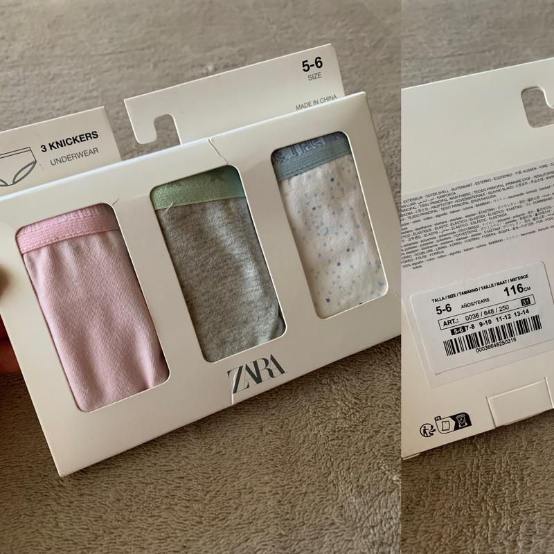 Тільки оригінальна продукція бренду Zara, викуплена в європейських магазинів. Білизна для дівчат. В наявності: • розмір 5/6р (на 116см, 3шт) = ціна 475грн. Швидка відправка після: - повної оплати на карту Приват, Моно - передоплата 150грн - самовивіз Київ / Березняки - якщо замовляєте через безпечну Шафу доставка, вони співпрацюють по цій програмі лише з УкрПоштою і Meest (Нова Пошта не працює по безпечній доставці).