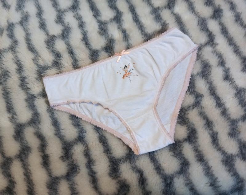 Бавовняні трусики для дівчинки Розмір - 128/134 Заміри: ширина по резинці 27-36 см, висота посадки 18.5 см. Внутрішня етикетка зі складом відсутня. Тканина - бавовна. В дуже хорошому стані