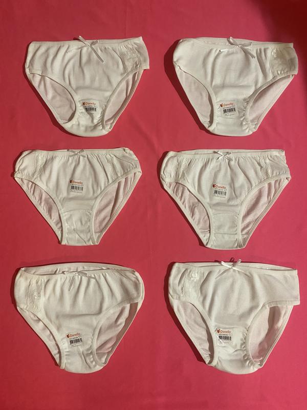 Комплект трусиків на дівчинку 10/11 років У комплекті 6 шт. білих однотонних трусиків, по боках прикрашених мереживою стрічкою( 2 шт прикрашені з обох боків; 4 шт з одного боку) Розмір: 146/152 см Заміри на останньому фото вказані не в розтягнутому стані Тканина: бавовна Ціна вказана за комплект (6 шт)