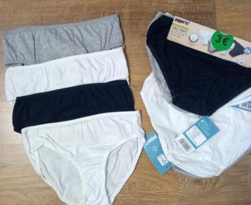 отличные хлопковые трусики от брендового производителя pepperts Германия. комплект состоит из четырех штук: двух человек белых, одни серые и одни темно-синие. в наличии размер 122-128 на 7-8 лет замеры длина бокового шва 7 см талия по резиночке 26 посадка спереди 19 см. и размер