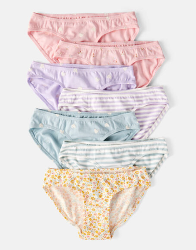 Цілий тиждень простих рішень. Цей комплект із 7 трусиків поєднує зручний крій із милими квітковими принтами, Особливості Набір із 7 пар дитячої спідньої білизни бікіні Високі вирізи для ніг для комфортного руху Приталений бікіні з класичним еластичним поясом Включає яскраві квіткові візерунки, сердечка та горизонтальні смужки М'які світлі кольори: блакитний, рожевий, лавандовий та інші Легке поєднання краси, мінімалізму та грайливості Ідеально підходить для щоденного носіння, шкільних днів або відпочинку на вихідних 95% бавовна, 5% еластан Імпортовано Можна прати в пральній машині Виготовлено з сертифікованої тканини Oeko-Tex: STANDARD 100 by OEKO-TEX®20.HUS.3936
