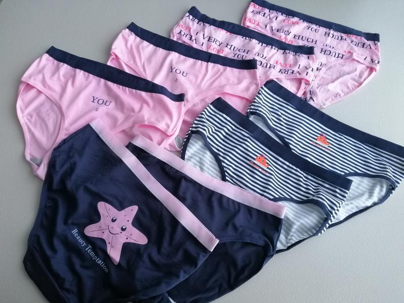 Новый комплект трусиков для девочки 13-14 лет. Тоненький трикотаж. Комплекти 8 шт,можно разбить по 4 (колыре пополам). Гарно тягнуться. В поясе 30,бедра 33, высота 25.