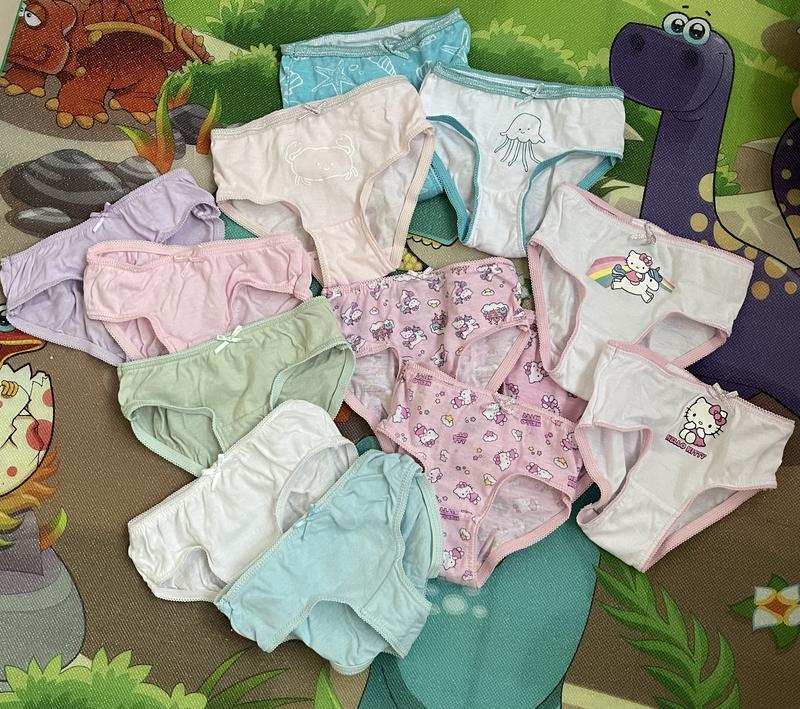 Три комплекта трусиків для дівчинки на розмір 74-80 см (6-12 місяців). Носили виключно зверху на підгузок. Стан ідеальний. Ціна за всі - 100 грн. Якщо окремо, то набори з 5 пар - по 70 грн., набір з 3 пар - 50 грн.