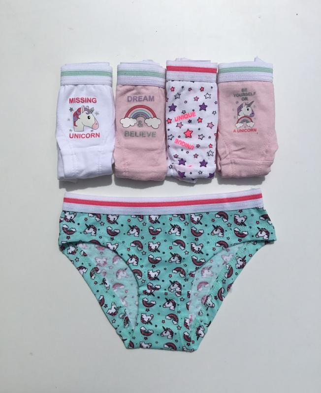 Трусики шортики для девочки с принтом "Единороги" 5 штук. в упаковке Материал мягкий, эластичный Резинка в поясе широкая, очень хорошо тянется Размеры: 92 см (1.5-2 года), 122 см (6-7 лет) 95% бавовна, 5% еластан Доставка: Нова пошта: по суботам. Условия оплаты: *По полной предоплате на карту *По предоплате 200 грн, остальные наложенным платежей. Обмену и возврат нет.