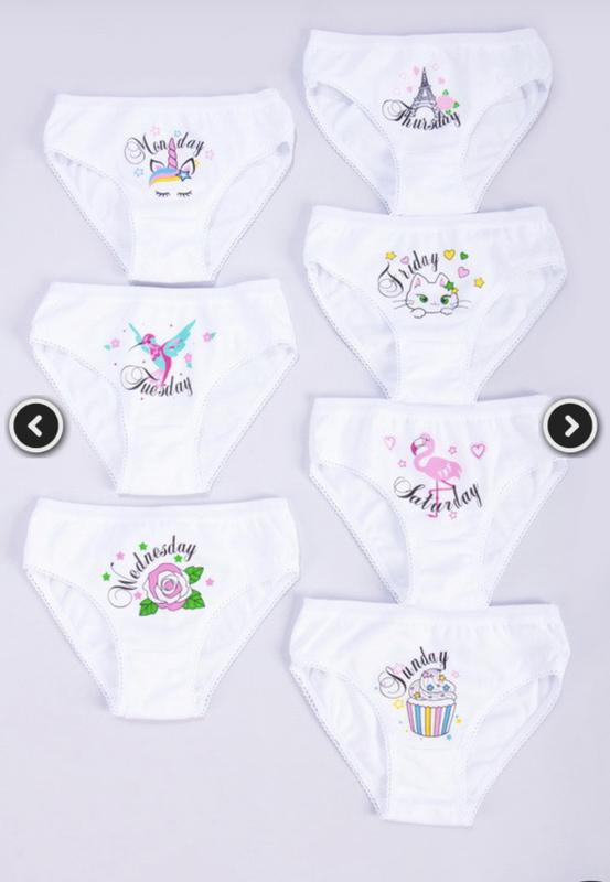 Трусы для девочки "Неделька" ( 7 ед. в упаковке) Комплект выполнен из белой фуликры. Полотно приятное к телу, хорошо тянется, восстанавливает форму. Трусы украшены тематическим накатом. Подходят для повседневной носки в любое время года. Рассчитаны на девочек возрастом от 4 до 13 лет в зависимости от роста. Трусы Размер 32 Размер 34 Размер 36 Размер 38 Размер 40 Допуск Ширина изделия по бедрам 24 26 28 29 30 ±1 Высота по центру переда 17 18 20 21 22 ±1