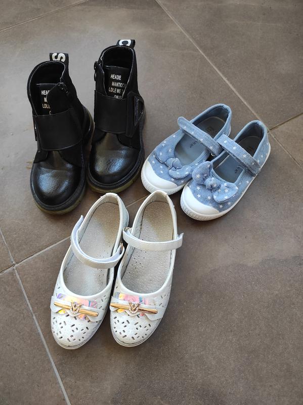 Продаю набором- 450 грн і окремо: Ботінки 27р. ( стелька 17 см) - 250 грн Білі туфлі -28р (18,5 см ) -150 грн Сині текстильні туфлі 27р ( 17,5 см) -100 грн Стан задовільний, на фото видно.