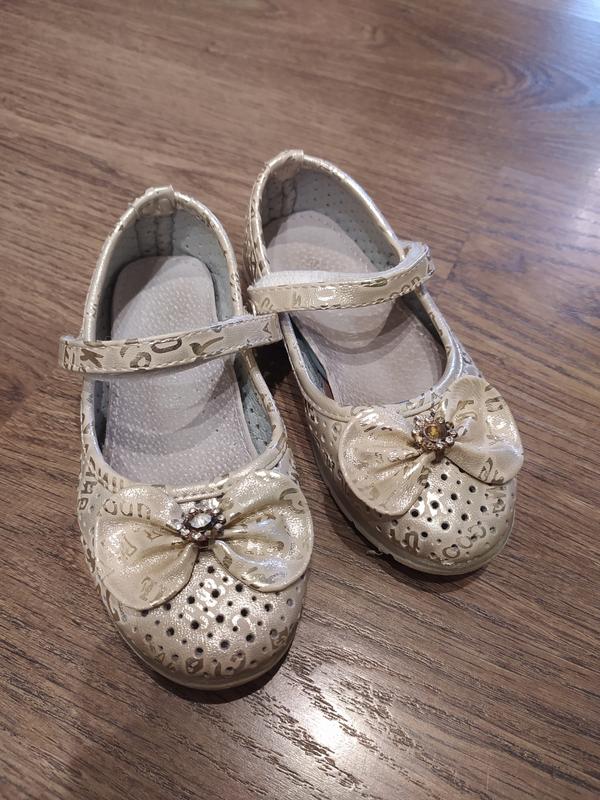 Туфлі в сіточку в гарному стані. Заміри устілки на фото, виходить майже 17, 5 см. Розмір 28. Всі дефекти на фото. Не має декількох камінців на бантику. Колір золотистий