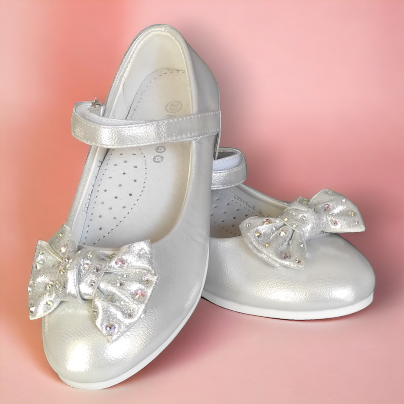 Нарядные красивые туфли для девочки под платье праздничные с бантиком серебро