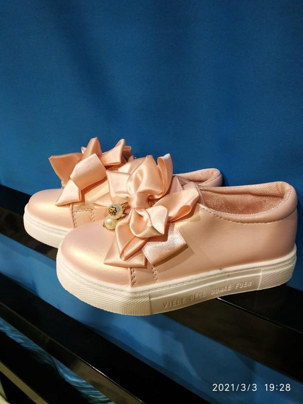 Ефектні перламутрові туфлі-кеди на дівчаток, які люблять спортивний гламур в одязі. Виконані туфлі з якісної еко-шкіри, які прикрашені перлинами та бантиком. Така модель туфель для дівчинки чудово виглядатиме як зі спортивним костюмом, так і з сукнею. Виробник Румунія. В наявності такі розміри: 25р-15,5см 26р-16,0см 27р-16,5см 28р-17,0см 29р-17,5см 30р-18,0см