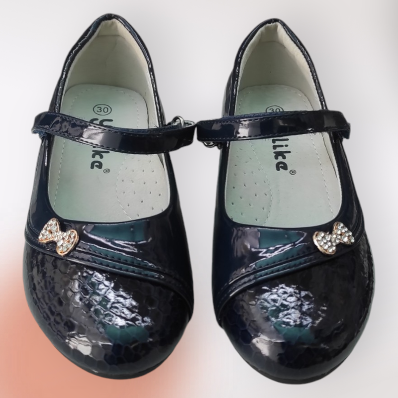 Детские синие лаковые туфли на каблуке для девочки школьные