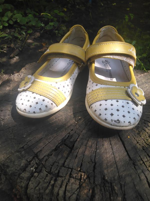 туфельки біло-жовтого кольору фірми шалунішка. Ортопедична устілка, гарний стан,липучки тримають гарно, лише на лівому трішечки носочок зачеплений , на фото видно. Розмір 26-16,5см.