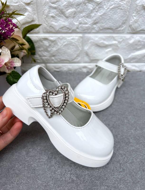 К.1363 👧Стильные белые туфельки Clibee, верх лакированная эко-кожа, стелька кожаная анатомическая, регулируются липучкой, подойдут на нормальную ты широкую ножку, украшение снимается. 26р стелька 16,5см 30р стелька 19см