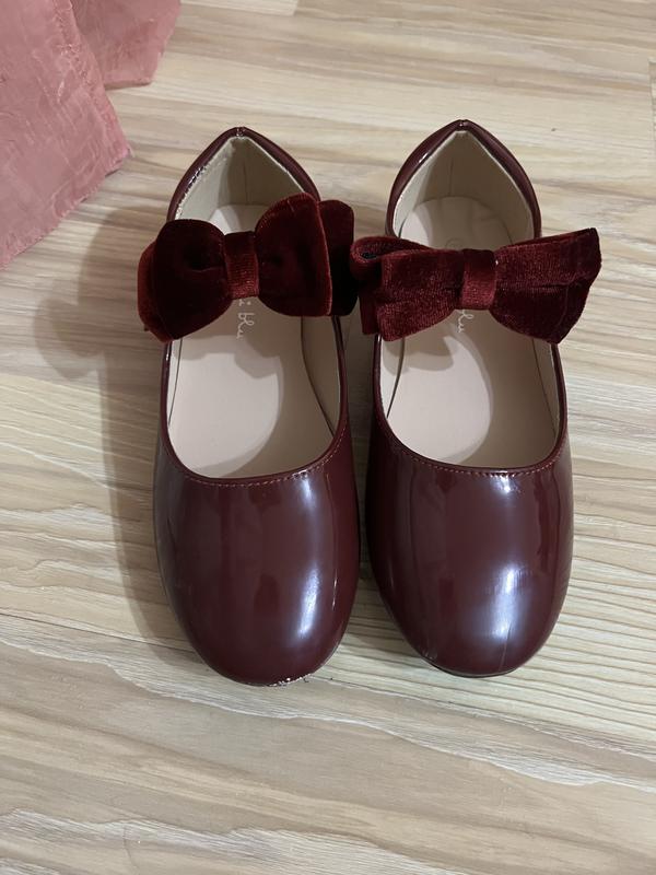 Туфлі в стилі напівсеревик бордового кольору. Застібка ліпучка прикрашена велюрним бантом Маленький каблучок 1см Розмір 32 Довжина устілки 20,6см Рекомендована довжина стопи 20,1см Має потертості на носках - додаю фото