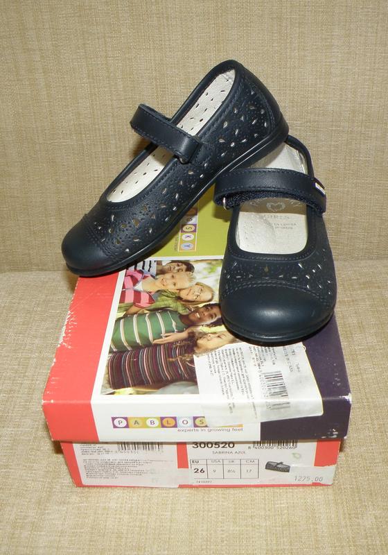 Новые ажурные туфельки Pablosky, оригинал, покупала в магазине "Антошка". Размер англ. 8,5, амер. 9, евро 26, стелька не вынимается, внутри намеряла 16 см. Ножка должна быть меньше. На худенькую и среднюю ножку. Верх и внутри - натуральная кожа. Ортопедически правильные - твердая пятка, каблук и супинатор. Качество отличное. Производство Испания. В коробке. Цена - 730 грн.