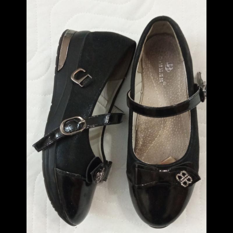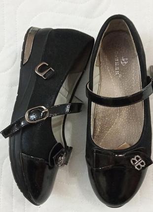 черные на платформе туфли с ЭКО кожи.стелька с натуральной прошита и подстилка сбоку.пряжка и носок и сверху бантики с лаковой кожи.остальной материал типа пропитки с блеском.на бантиках в пластике с букв торговой марки две буквы в вклеяны камышки.сзади на пятке деталь под метал нержавейки.состояние на очень хорошее.размер-32. стелька-20.5 см.