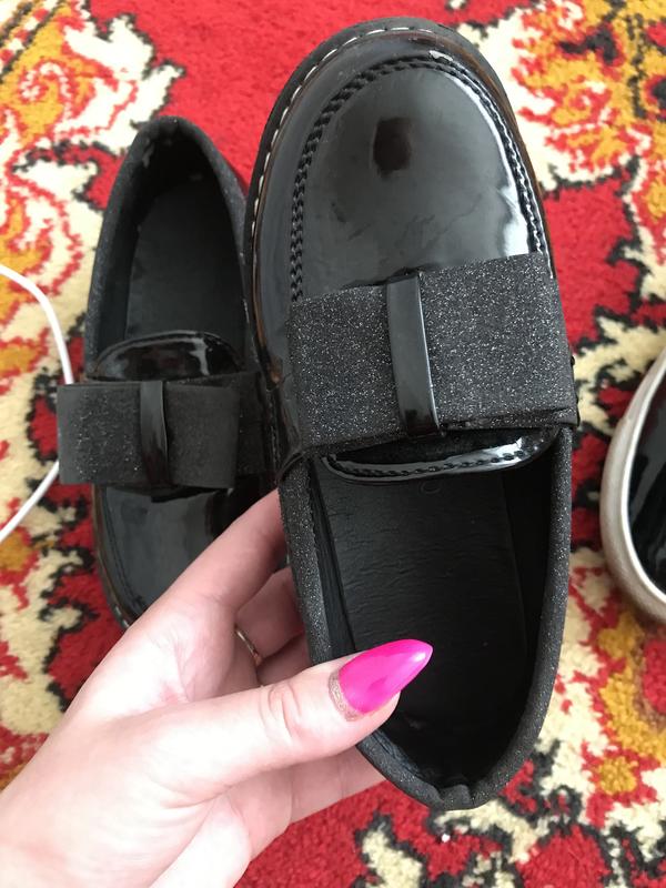Туфли на девочку, размер 30 на среднюю полноту ножки, стельку замерить не возможно так, как она приклеена. Стан на фото. Круто блистают на солнце, бантик на одном можно заменить. Купила их при 465 грн. Из-за нюансов отяжу дешевле.