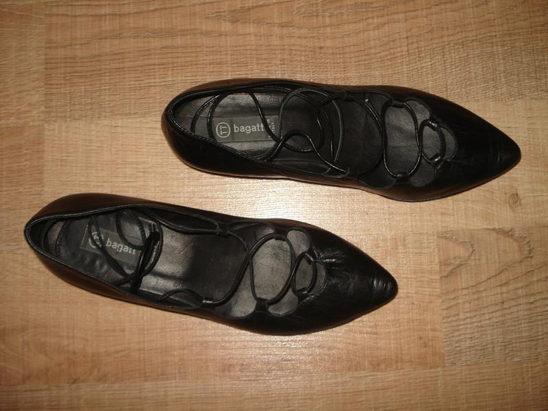 Туфли BAGATT с завязками Размер - 35 Длина по внутренней стельке - 23 см. Ширина подошвы в самом широком месте - 7,8 см. Высота каблучка - 2 см. Цвет - чёрный. Материал - натуральная кожа. Произведено в: Италия. На подошве и каблучке - профилактика. Туфли в очень-очень хорошем состоянии.