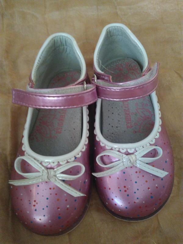 Красиві туфлі для дівчинки з екошкіри. Носили мало. Шкарпетки не збиті, потертостей немає.