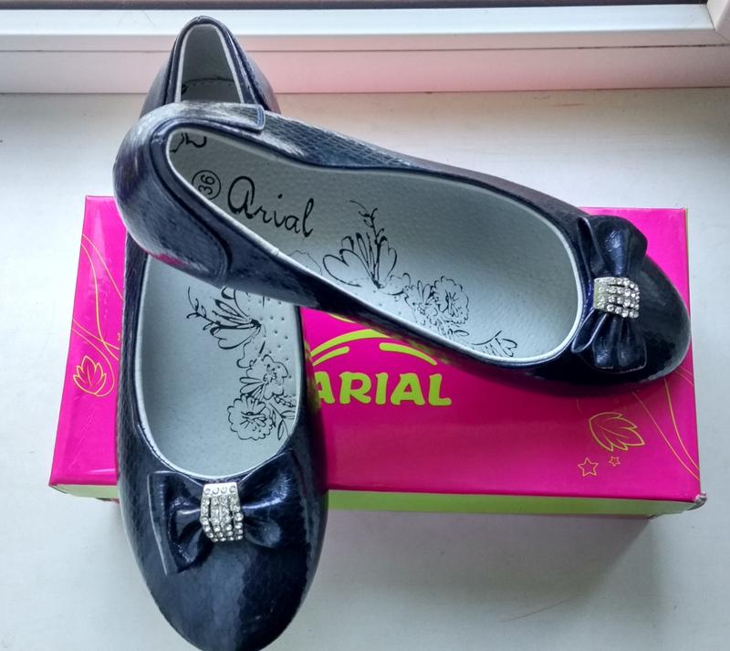Темносині туфлі українського виробника Arial. Устилка дихаюча шкіряна з супінатором, підошва полімер, верх штучна шкіра. Підошва має невеличку танкетку, завдяки якій ніжка менше стомлюється. Довжина по устилці 23,0 см.