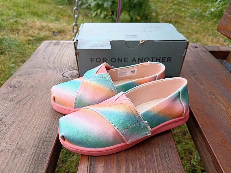 Легке взуття для дівчинки фірми Toms (Іспанія). Різнобарвне з блиском. Для зручності є липучки по боках, а також в центрі - резинка. Розмір 28-29, 17.5 см. Стан - двічі взувалися, бо перестрибнули за зиму розмір. В наявності коробка, в якій продавалися.